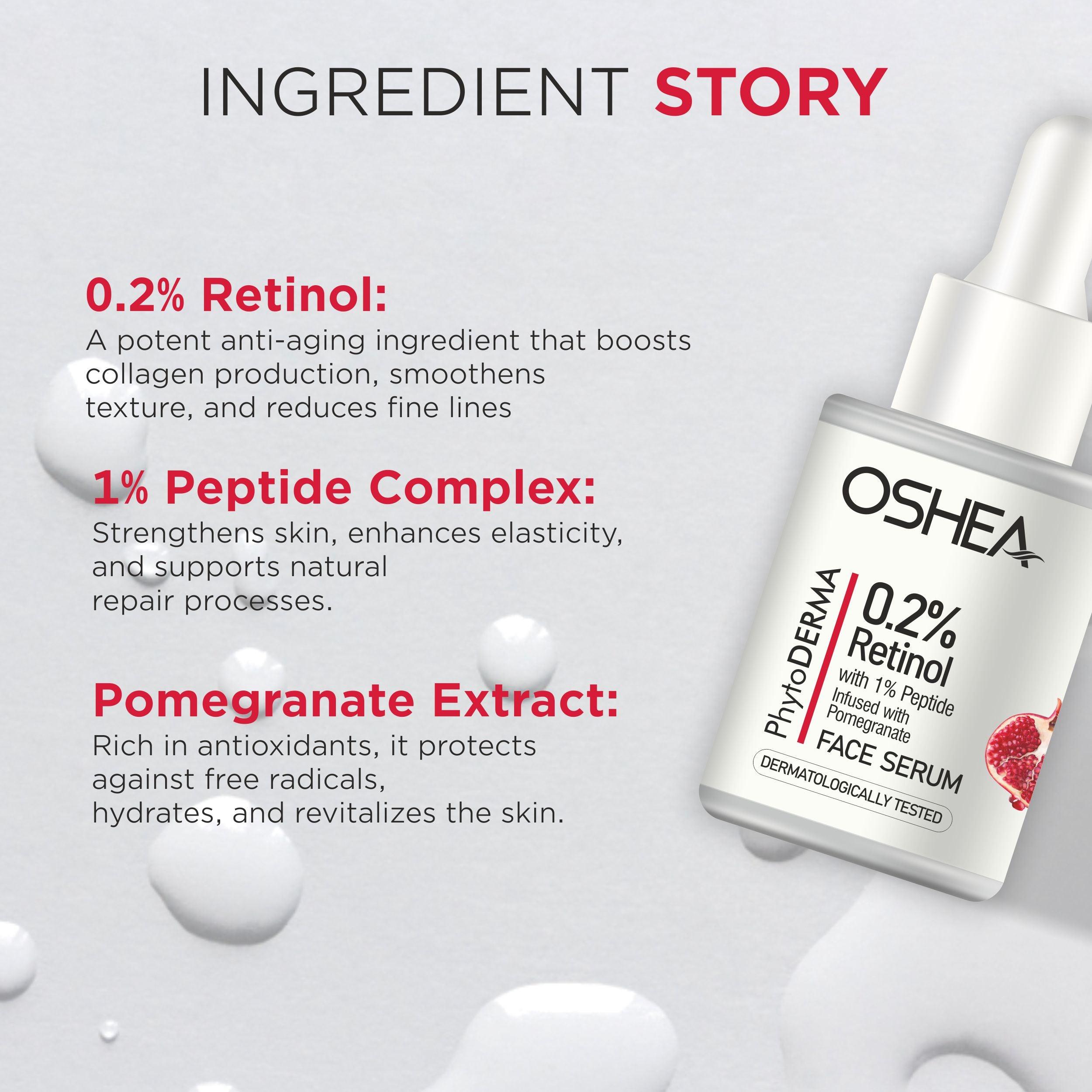 Benefits of Oshea PhytoDERMA 0.2% Retinol + 1% Peptide infused with Pomegranate Face Serum