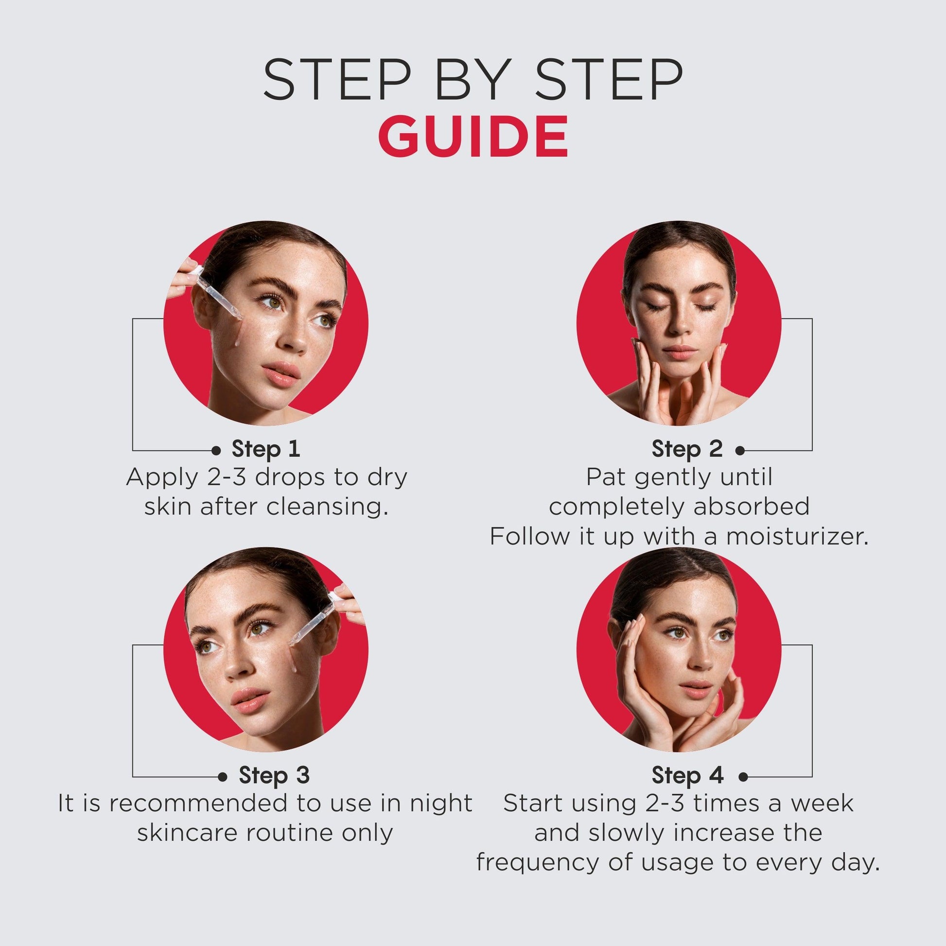 Apply 2-3 drops to dry skin after cleansing.
