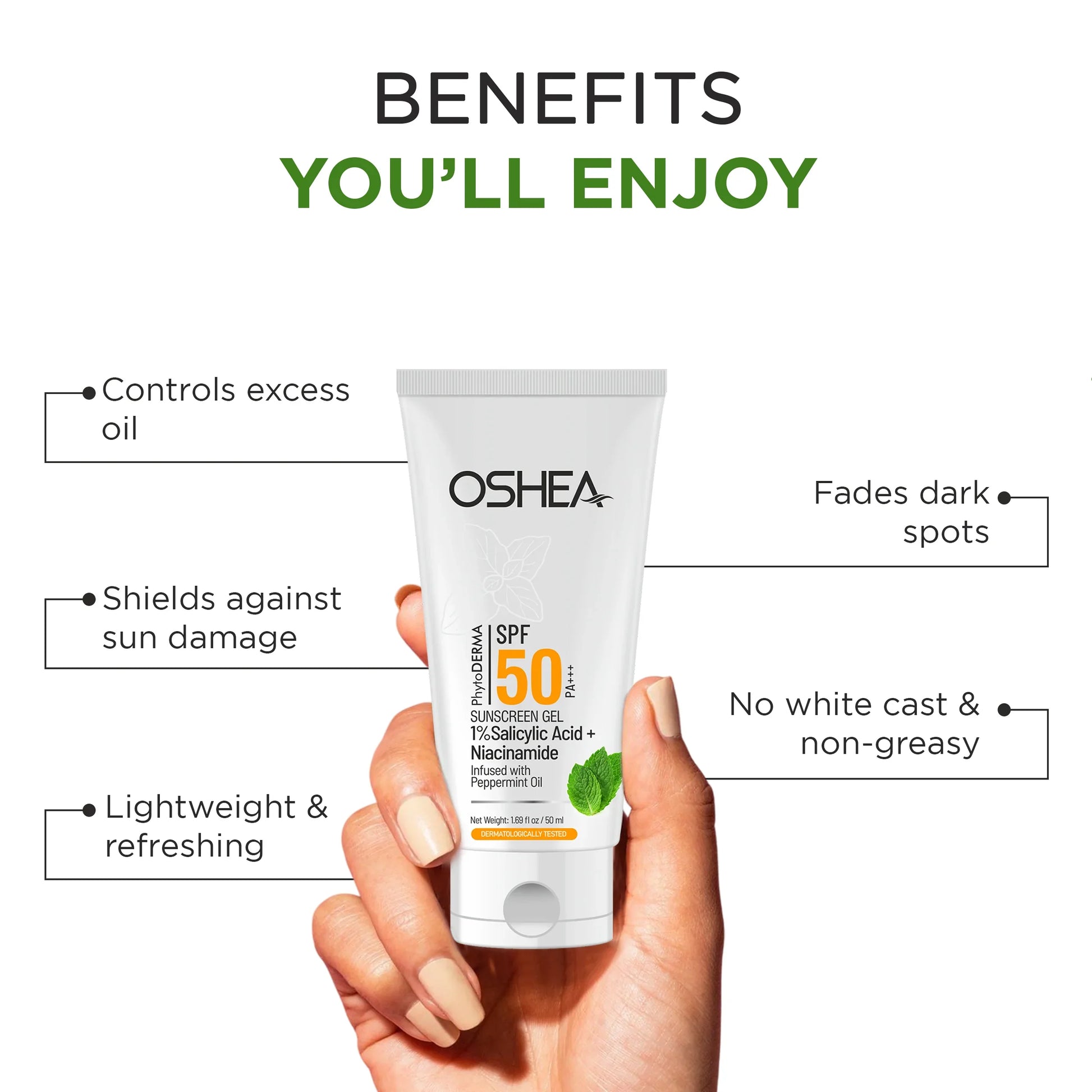 Protect your acne-prone skin with PhytoDERMA 1% Salicylic Acid SPF-50 PA+++ Sunscreen gel. Its encapsulated Salicylic Acid controls acne, regulates oil, and unclogs pores, while Vitamin B3 evens skin tone. This oil-free formula also protects against environmental stressors and keeps skin hydrated for a brighter, smoother complexion all day long.