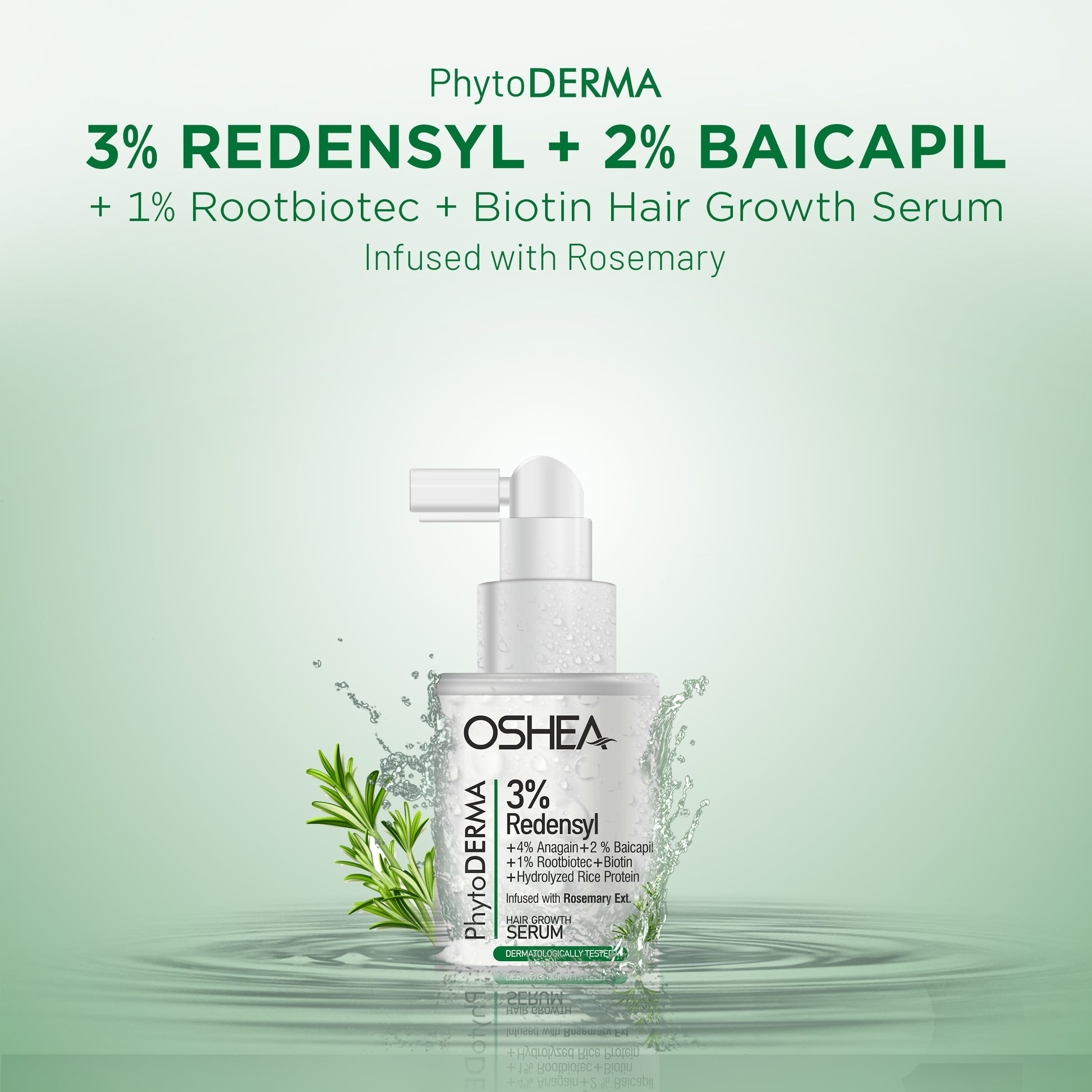 Oshea Herbals PhytoDERMA Hair Growth Serum is an advanced, multi-active blend formulated with 3% Redensyl, 2% Baicapil, and 1% Rootbiotec. This safe and effective, dermatologically tested serum is enriched with natural actives and infused with rosemary to nourish and promote healthy hair growth.