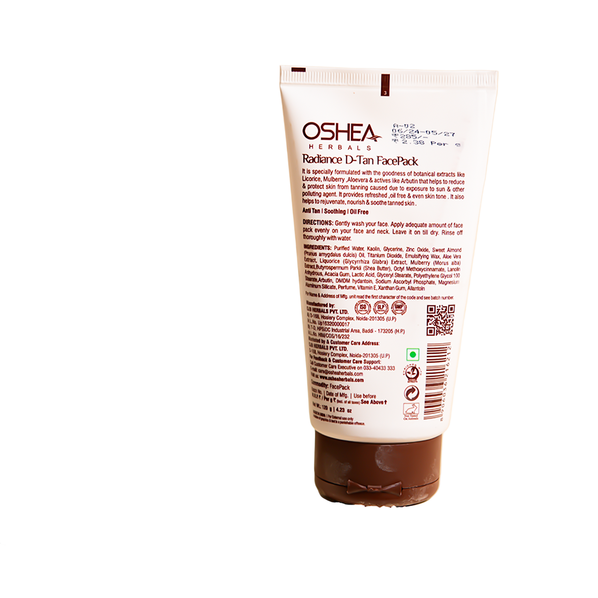 Oshea Herbals Radiance D-Tan Face Pack exclusive formulation contains scientifically extracted actives – Arbutin, Aloe vera, Mulberry, and Licorice extract that help to reduce and remove the skin tan. Skin becomes soft, smooth, and glowing.